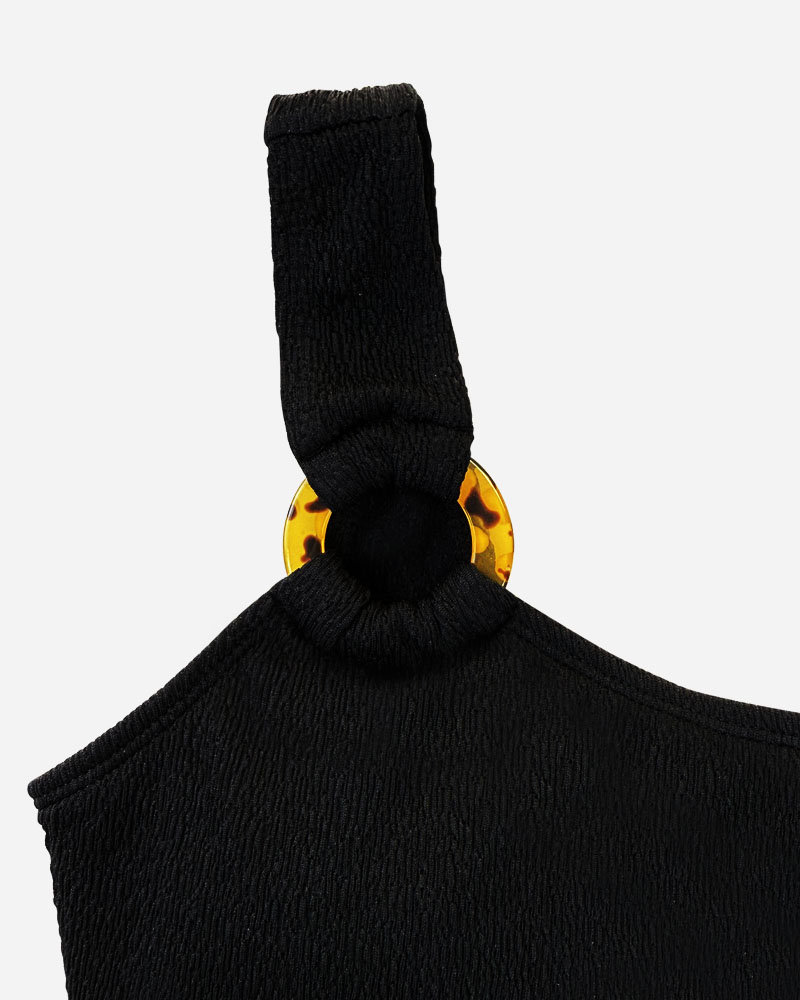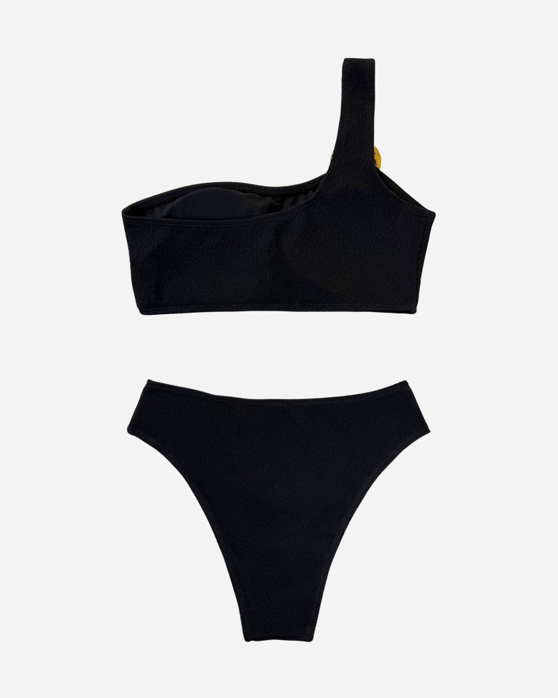 Experience the fusion of fashion and functionality with One Shoulder O-Ring Bikini Top & High Cut Bikini Bottoms Set.